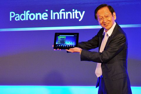 華碩董事長施崇棠親自在MWC發表搭載5吋Full HD螢幕的Padfone Infinity變形手機,可變身為10.1吋平板電腦。