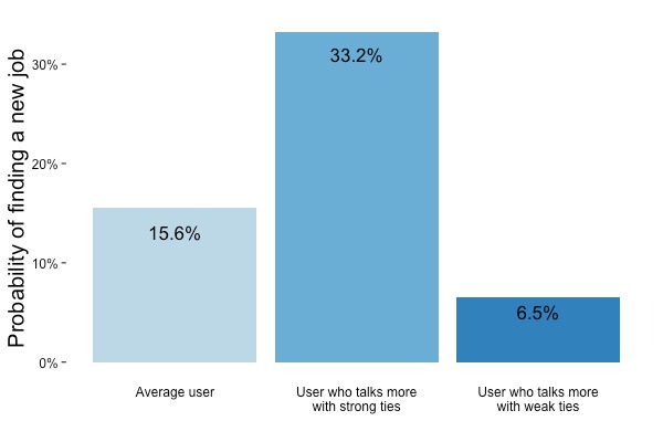 根據調查,臉書用戶在三個月內找到工作的平均比率為15.6%,與強烈連結友人有更多交流的用戶找到工作的比例為33.2%,若是與薄弱連結友人有更多交流的用戶找到工作的只有6.5%。