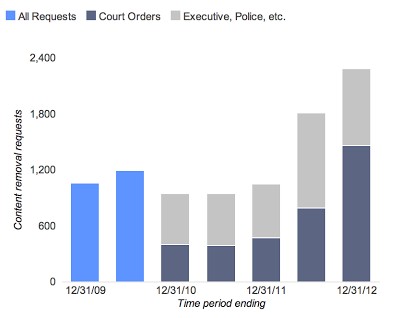 Google公布去年下半年的透明度報告,顯示去年下半年Google總計收到2285個來自各國政府的資料移除請求,以移除2.4萬筆內容,比2012年上半年的1811個請求與1.8萬筆內容分別增加26%與33%。