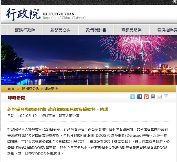 行政院週日發表聲明表示,發現匿名的菲國駭客對我國政府及民營企業發動網路攻擊,遭到DDoS阻斷服務及置換網頁等攻擊。總統府、國防部、海巡署等網站受到DDoS攻擊後,經過阻擋IP位址,相關網站已恢復正常功能,行政院資安辦公室研判攻擊來源為菲律賓。