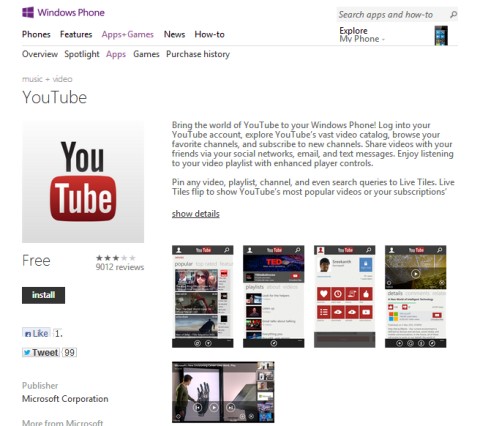 ↑ Google要求微軟撤下這款微軟在Windows Phone Store中推出的YouTube程式。