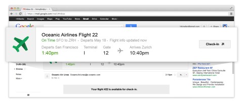 這些「快速行動」按鍵只會出現在特定類型的郵件主旨上,像是宴會邀請函,或是評比剛去過的餐廳。此外,當開啟一個確認班機的郵件時,有關該班機的重要資訊便會顯示在郵件的最上方,完全不需捲動頁面。