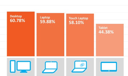 若從另一個角度找出每天執行不到一次Metro程式的用戶比例,則發現桌上型電腦用戶佔了60.78%,筆電用戶佔了59.88%,觸控筆電用戶佔了58.1%,平板電腦佔了44.38%。顯示即使在平板電腦上Window 8使用者仍然有超過四成鮮少使用Metro介面。