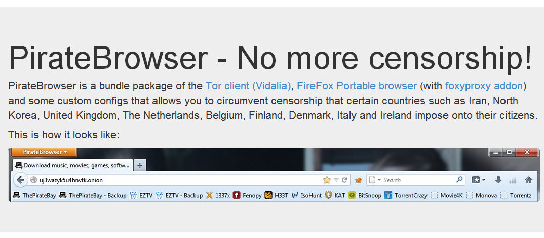 海盜灣成員在部落格表示,只要滑鼠按一按,PirateBrowser就能輕易繞過審查及障礙,立即存取到使用者想看的網站,而除了確保隱私和預設Firefox瀏覽器之外,PirateBrowser不包含廣告軟體、工具列和其他累贅的東西。PirateBrowser另外還包含一些被禁網站的書籤,像是海盜灣、EZTV、KickassTorrents等。