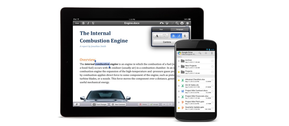 但現在,具備Google帳號的iOS或Android裝置用戶只要透過App Store或是Google Play下載Quickoffice並登入Google帳號,就可以在iPhone、iPad或Android裝置上編輯微軟Office中的Word、Excel或PowerPoint檔案;由於Google己經整合Quickoffice與Google Drive,因此使用者利用各種裝置都能存取Quickoffice檔案。