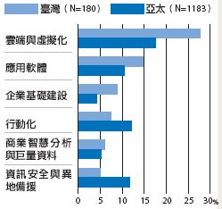 依據IDC日前發布2013年臺灣地區的CIO調查結果顯示,未來一年企業的資訊投資將會著重在雲端部署與行動化管理,這兩者的重要性百分比都顯示超過6成,同時並有四分之一以上的企業,將在未來一年內投入雲端的相關部署計畫,這比例高出亞太地區10%。