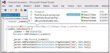 除C++ 11版標準支援外,VS 2013 RC版也改進了程式碼資訊檢視。在預覽版中,開發者能夠在程式碼編輯介面查看每行程式碼的撰寫者、修改歷程、以及修改理由的CodeLens功能,在RC版中,CodeLens則整合了微軟的Lync通訊平臺,開發者能透過Lync直接與先前撰寫此段程式碼的所有開發者線上討論。