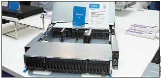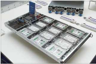 英特爾在臺展示了使用Atom C2000系列處理器的系統,可用作微型伺服器與冷資料儲存,圖中為華擎(ASRock)推出的1U12LW,即是屬於這樣的應用類型。目前該產品採用的處理器是8核心Atom C2750,未來也可搭配4核心Atom C2550。1U12LW的最顯著特色,是在1U機身內即可搭載12臺3.5吋SATA硬碟,在有限的機箱空間內,所容納的磁碟數量相當驚人,其中6臺是透過Atom C2000系列內建的SATA控制器連接,而其他臺硬碟,則透過整合Marvell SE9230和Marvell SE9172等晶片取得連接能力。