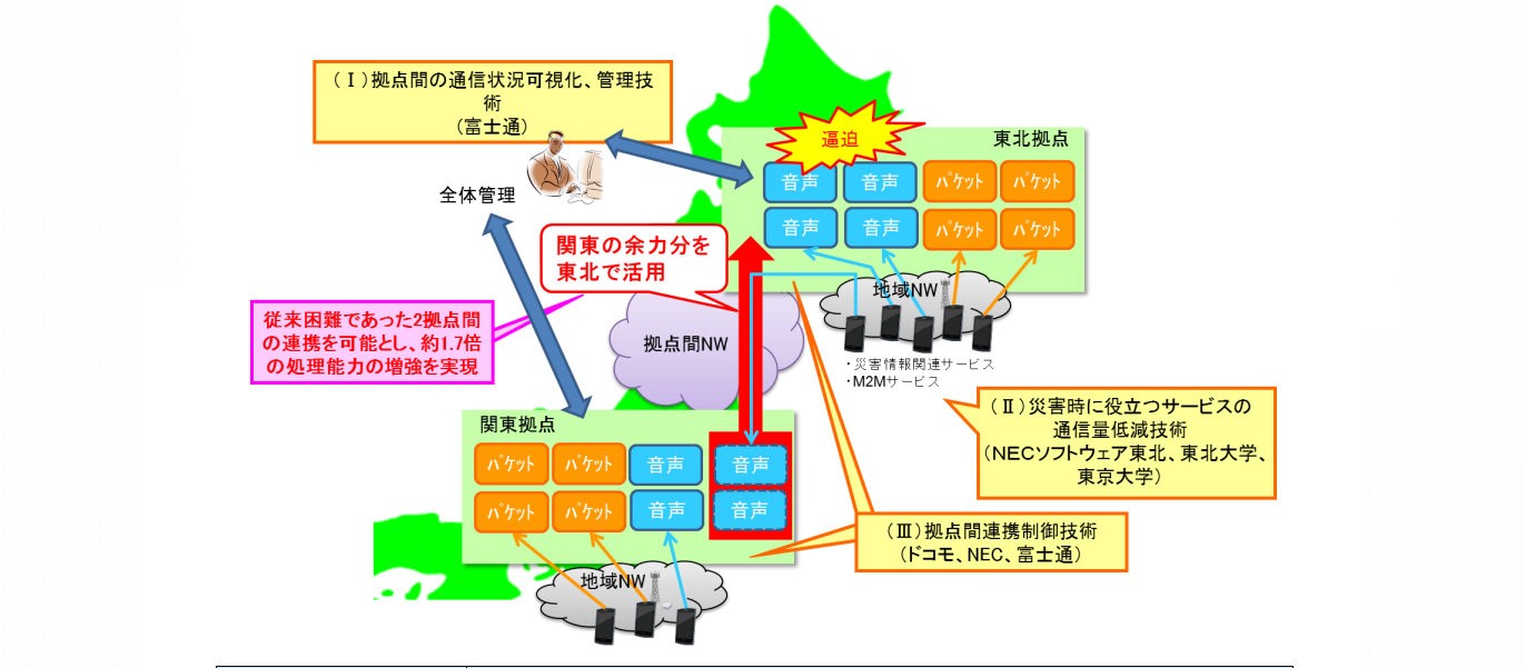 NTT docomo週三(10/2)宣布將與NEC、富士通、日本東京大學與東北大學共同實驗紓解大規模災害通訊障礙現象的技術。當災害發生導致通訊品質下降、無法通話等現象時,如何有效活用仍有通訊頻寬餘力的地區所擁有的設備緩解此現象。