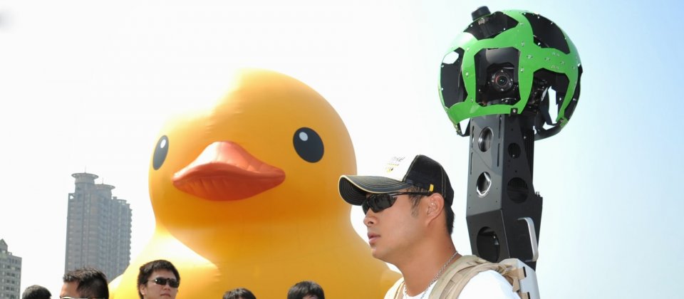 Google街景背包前往高雄地區拍攝特殊景物,最近炙手可熱的高雄黃色小鴨未來將納入Google台灣地圖街景,外地民眾透過網路就能瀏覽黃色小鴨。