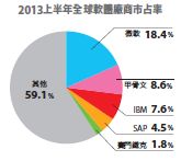 調查機構IDC發布2013年上半年軟體廠牌市占調查結果,以全球軟體廠商營收來估算市占率時,微軟市占率為18.4%,意即若全球營收總額是100元,微軟就占了其中18.4元,大幅領先於排名第二的甲骨文(市占8.6%),其次是IBM市占7.6%,SAP市占4.5%。