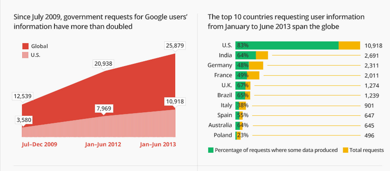 Google周四(11/14)公布每半年一次的透明度報告,顯示政府對使用者的資訊請求次數愈來愈多,全球政府所提出的資料請求次數是2009年的兩倍,美國政府所提出的資料請求次數更是2009年的3倍,而且這些數字還不包括被禁止公布的數據。