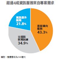 根據調研機構IDC(國際數據資訊)2013年臺灣資訊科技服務追蹤半年報,整體資服市場營收達348億元。進一步分析營收比例,超過4成(43.3%)的資訊科技服務是專案導向服務,其次為支援與教育訓練(34.9%)及資訊委外服務(21.8%)。