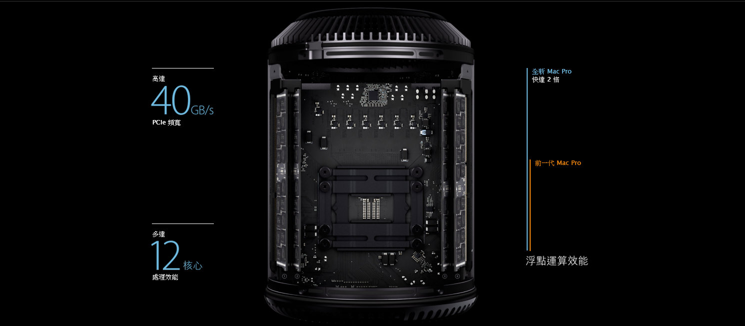 首度採用圓筒狀設計的Mac Pro配備最新的Intel Xeon處理器,可選購4核心、6核心、8核心或12核心等版本,每核心最高時脈為3.9GHz,其浮點運算效能為前一代Mac Pro的兩倍;兩個工作站等級的AMD FirePro GPU則提供最高12GB的影片記憶體與7 Teraflop/s的運算能力,其繪圖效能最多為前一代的8倍。