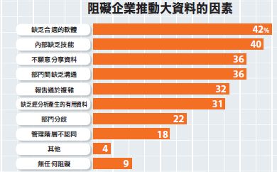 根據該調查,阻礙大資料發展的原因,大多數來自企業內部的問題,因為超過9成的主管認為內部因素是阻礙大資料進展的原因。42%的主管認為缺乏合適的軟體,40%的主管認為內部缺乏技能,其他問題如不願意分享資料,占36%,部門間缺乏溝通占36%、報告過於複雜占32%、缺乏經分析產生的有用資訊占31%、部門分歧占22%、管理階層不認同則占了18%。