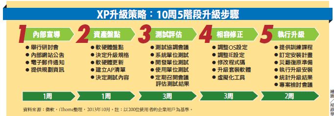 微軟先前也提出5階段的升級步驟, 建議XP升級的流程先從內部宣導開始,再進行資產盤點、測試評估、相容修正,最後執行升級。臺灣微軟表示,200臺XP電腦規模的升級作業,按此5階段依序升級,需要10周時間才能完成。