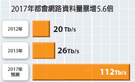 日前,阿爾卡特朗訊(Alcatel-Lucent)旗下的貝爾(Bell Labs)實驗室,公布了一份網路流量報告預測,指出2014年影音串流資料將成長7.2倍,而資料中心的資料交換量也將成長4.4倍。這兩大因素影響下,2017年全球都會網路(Metropolitan Area Network,MAN)流量將暴增為2013年的5.6倍。