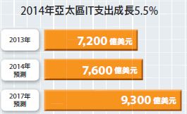 Gartner預測2014年亞太區的企業IT支出將成長5.5個百分點,從2013年的7,200億元,來到7,600億美元的總值。Gartner資深副總經理Peter Sondergaard表示:「一個以IT為主導的數位世界已經來臨,幾乎每筆企業的預算都是IT預算,每個公司都將成為科技公司。」