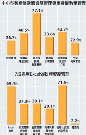 最近這一兩年,臺灣使用盜版軟體的比例,已經逐漸下降37%左右,大多數企業雖然有使用合法軟體的認知,但卻缺乏完善的軟體資產管理機制。為了解企業的軟體資產管理狀況,BSA臺灣軟體聯盟委由IDC調查臺灣中小型製造業,以國際軟體資產管理流程框架ISO 19770-1為比較基準,結果發現有34%沒有任何相關管控機制,另外,已有軟體資產管理機制的企業中,也有高達7成的企業缺乏明確的軟體資產管理原則。