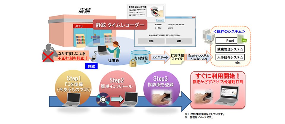 該社自2006年11月推出手指靜脈認證系統「靜紋J300」以來,至今已將手指靜脈認證應用於電腦登入與各種企業應用程式中,這次推出的「靜紋Time Recorder」可透過專用裝置內的近紅外線拍攝手指靜脈分布圖,比對事先登錄的手指靜脈資料進行個人認證,同時留下比對成功時間視為打卡簽到記錄,可避免非員工本人打卡所造成的企業管理盲點。