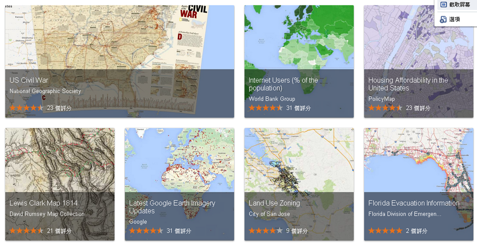 Google新服務Maps Gallery蒐集了各種不同的主題地圖,例如已蒐集了城市規畫地圖、氣候變遷地圖、美國各城市居民房價負擔能力分布圖、船難地點分布地圖等。Google也開放使用者上傳,如美國國家地理協會、世界銀行集團等組織已貢獻了不少地圖。使用者可自定地圖的使用限制,分享地圖的組織也有權更動地圖內容。