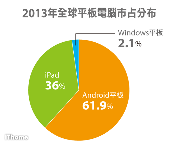 國際市調機構Gartner日前公布2013年Android 平板銷售1.2億臺。整體而言,Android平板總銷量占有率從2012年的45.8%擴大為61.9%,iPad市占從52.8%下滑到36%。但蘋果在高階市場仍然不可小覷,甚至iPad mini銷售量也超越競爭對手。