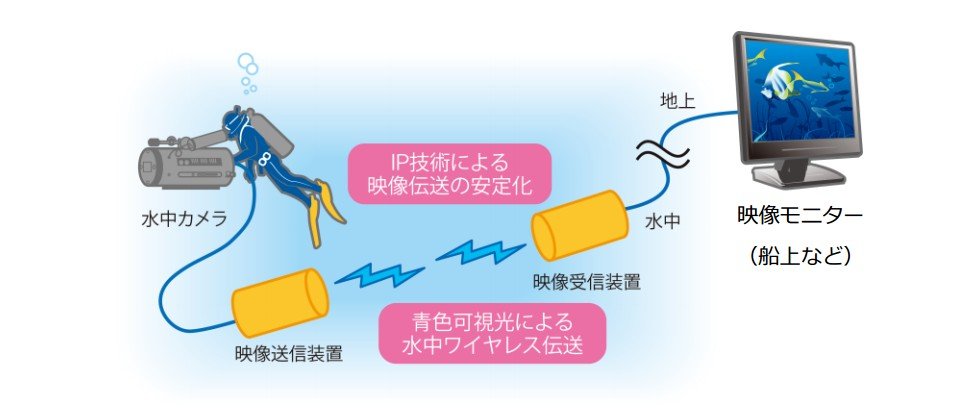 日本NHK週四(5/15)發表可在水中穩定傳輸影像訊號的無線IP傳輸技術,採用在水中不易出現衰減的藍色可視光作為影像訊號的傳播媒介,讓水下的工作人員能卸除纜線傳輸的負擔和危險性,並具有穩定的訊號持續傳輸能力。