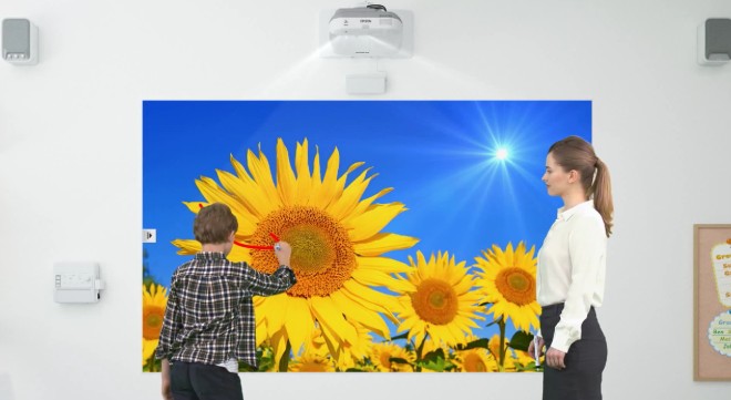 日本愛普生(EPSON)發表鎖定教育市場的超短焦投影機EB-595WT,內藏的電子黑板功能,可直接以手指在投影螢幕上進行簡單的觸控操作,支援以電子筆當書寫繪圖工具、手指當板擦等多種互動功能。
