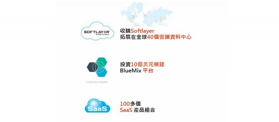 IBM朝向雲端服務商發展,包括三大項雲端服務,提供雲端基礎設施服務的Softlayer、下半年將推出的創作平台BlueMix及100多種的SaaS軟體服務。新的3項工具擴展IBM的雲端服務內容。