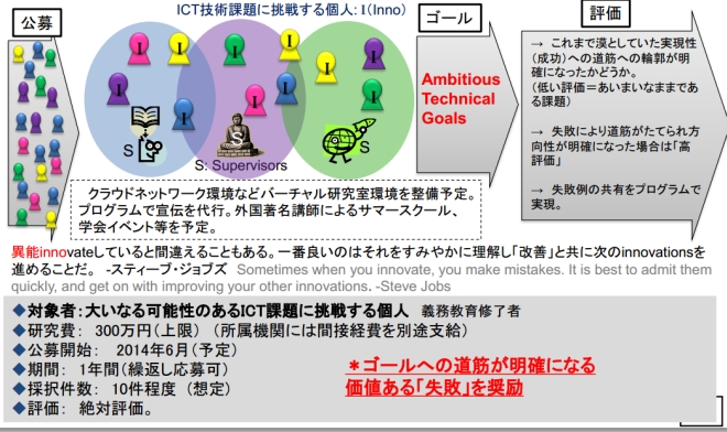 此補助政策又名「奇人名額」,希望能藉由此政策發掘日本的賈伯斯。總務省說明,只要是在ICT領域中,企圖創造出全球規模使用價值的技術、擁有極大可能性影響全人類的發明、有異想天開的點子,與獨特人格的研究者,均可申請此項補助。