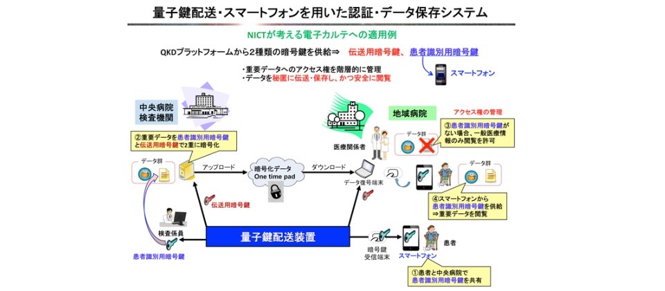 日本獨立行政法人資通訊研究機構(NICT)發表使用量子密碼和智慧型手機進行身分認證與保存資料的系統,可確保資料傳輸時的隱密性,以及嚴密的個人存取權限。