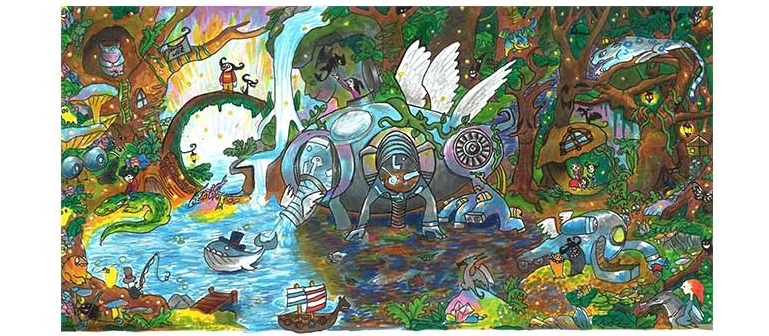 Zhang的作品「回到大自然之母」(Back to Mother Nature),以複雜構圖描述她想像自己發明能淨化水質的東西,她表示這個發明「可從河川、湖泊甚至海洋將污物及污染的水汲取出來,使水源變得乾淨、衛生,能滋養人類及動物」。