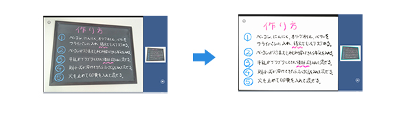 除了可直接編輯Windows Office文書檔案之外,dynabook Tab S50還安裝了可將會議資料迅速轉換為電子檔案的應用程式TruCapture。拍攝攤平於桌面上的雜誌或筆記資料後,可透過此程式自動把歪斜的圖像頁面校正為平面無歪斜的圖案;拍攝寫在黑板上的粉筆字時,也能將圖像轉換為較易閱讀的白底黑字圖像。
