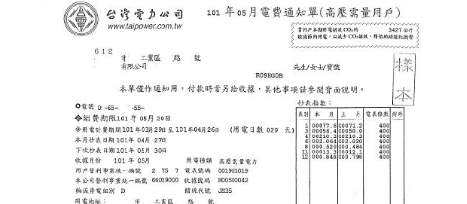 在台電的電費單中,包括了用戶資料,如企業地址、登記人姓名、企業用電電號、用戶登記的使用電表等,另外也記載了電費計費期間,和電表的抄表日期,以標示本月電費計價的起始與結束,這是用電戶的基本資料。