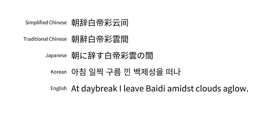 Adobe指出韓、中、日文漢字雖有共同的歷史淵源,但字體設計卻以各自的語言為主,即便是繁體、簡體中文也有差異。思源黑體為第一款可在同一字體系列中支援不同語言及區域性差異的開源字體,涵蓋約15億人口地區。