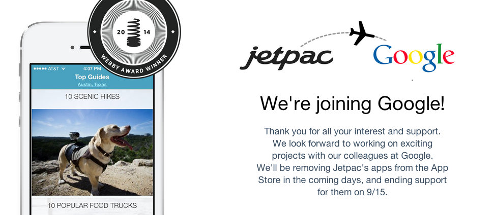 開發Jetpac City Guides城市指南行動程式的Jetpac在上周宣布已被Google收購,透過蘋果App Store出版的3款程式在最近幾天就會下架,並預計於9月15日終止對相關程式的支援。