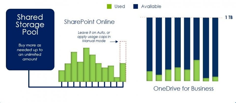SharePoint行銷部門資深產品經理Mark Kashman指出,最新的調整下,SharePoint Online預留儲存空間的概念由網站層改成SharePoint Online租戶層級,不再和網站集合(site collection)綁在一起。舉例而言,過去管理員為某個網站配置100GB儲存空間,但只用了20GB,剩下80GB就閒置掉了。在新的模式下就可以將80GB歸還到租戶儲存共用區,共用儲存區只會將實際用掉的部份扣除。微軟表示,這樣一來,網站管理員將能更彈性管理儲存空間使用。