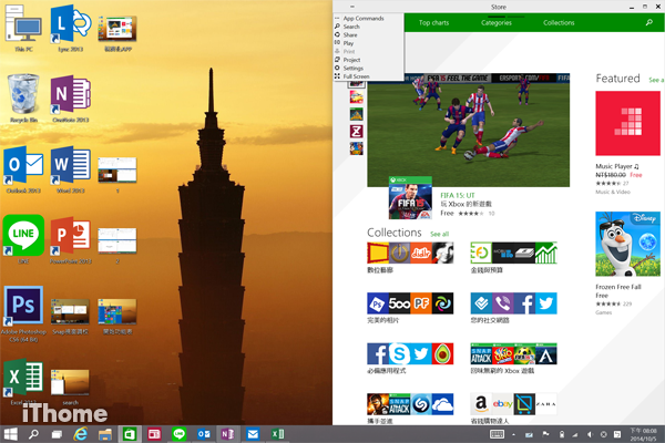 但Windows10將App視窗化,讓App也能和傳統桌面程式一樣,在傳統桌面中運行,也就是說,除了縮小、關閉之外,使用者可以任意調成想要的視窗大小,也可以使用接下來會提到的Snap視窗調校功能。
