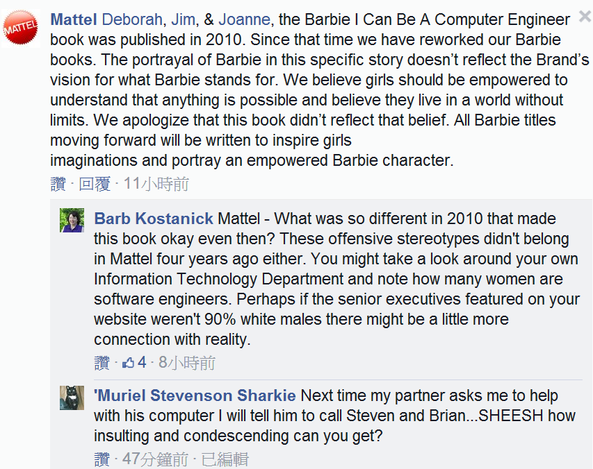 ↓Mattel在粉絲頁上對於把芭比塑造為一個無能又不負責任的電腦工程師而公開致歉。