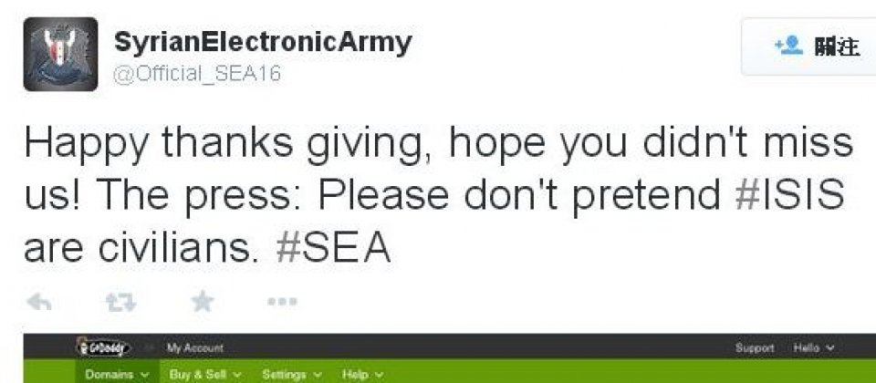 包括Forbes、The Independent、芝加哥論壇報、衛報與CNBC等多個媒體網站都在周四(11/27)出現「你已被敘利亞電子軍入侵」(You've been hacked by the Syrian Electronic Army)的訊息,不過,敘利亞網軍並未真正入侵了這些網站,而是駭進了這些網站所使用的身份管理平台Gigya的網域名稱註冊商,並將流量導至另一個顯示該訊息的網站,屬於DNS(Domain Name Service)攻擊。