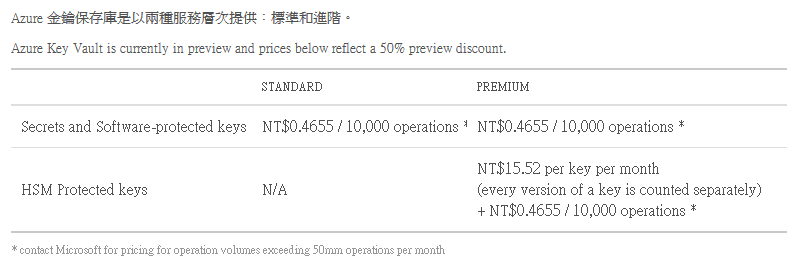 目前台灣微軟的Key Vault預覽版已經上線,中文名稱為「金鑰保存庫」,其訂價則區分為標準與進階兩種等級,目前提供50%的折扣優惠(↓下圖)。