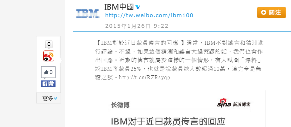 通常IBM不對謠言和猜測進行評論;不過,如果這個猜測和謠言過於荒謬的話,我們也會作出回應。近期的傳言就屬於這樣的一個情形,有人試圖〝爆料〞說IBM將如何裁員26%,也就是說裁員總人數超過10萬,這完全是無稽之談。