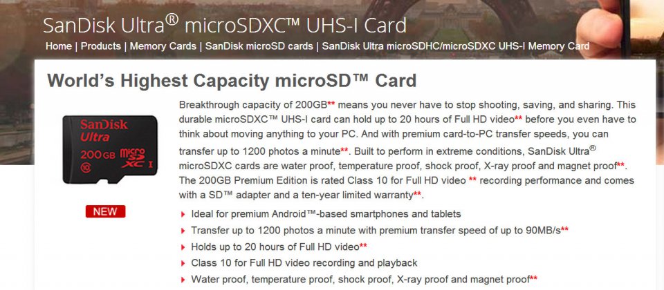 記憶體大廠SanDisk在本周日(3/1)發表全球首款儲存容量高達200GB的microSD記憶卡,以因應今日行動用戶的高儲存容量需求,讓手機使用者能夠更安心儲存照片、影片或音樂等檔案,而不用擔心容量問題。新款的200GB SanDisk Ultra microSDXC UHS-I記憶卡高級版預計於今年第二季出貨,售價為399.99美元。