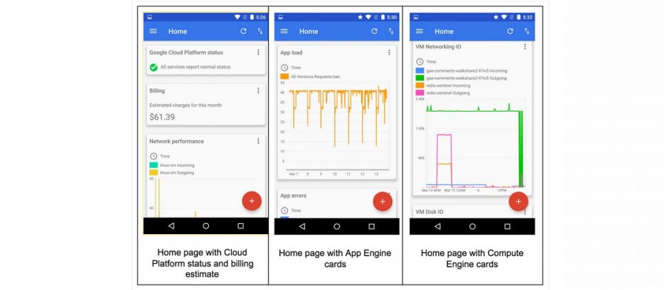 Cloud Console for Android允許開發人員建立自己的個人化首頁,設定客製化儀表板,例如雲端平台的狀態、價格估計,或是App Engine的使用。該程式整合了Cloud Monitoring功能,可在偵測到特定系統指標或發現意外狀況的時候進行通知。