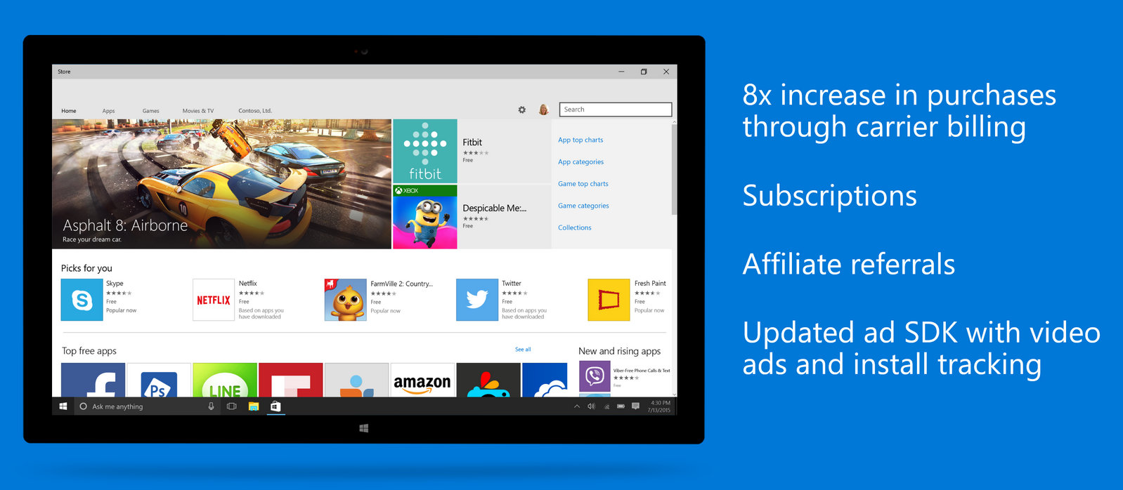 除了電信帳單支付外,微軟也更新Windows 10的Microsoft Advertising SDK,提供影音廣告功能並可追蹤安裝數量,以及支援程式內購買訂閱,並祭出新的Windows Store推廣計畫(Windows Store Affiliate Program)。