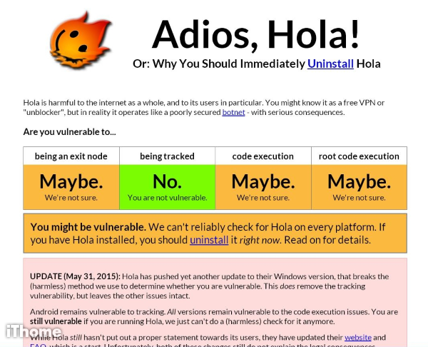 然而,8Chan指出,Hola的手法會對使用者帶來法律上的風險,而且Hola在去年底還將Hola網路資源打包銷售,推出名為Luminati的付費服務,把Hola網路轉成可操控的殭屍網路。(詳全文)