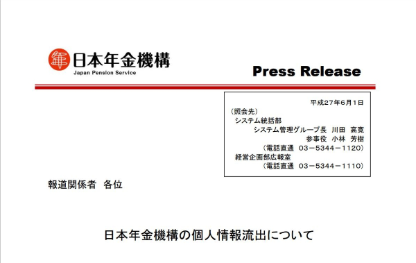 日本國民年金機構於6月1日對外證實,由於職員誤開了含病毒的電子郵件,導致機關內保存的國民年金相關個資外洩,目前已確定有125萬筆國民個資外洩。