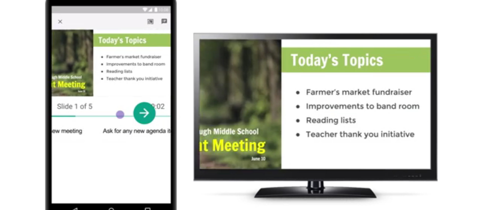 Google Slides可於行動裝置上建立、編輯及分享簡報,過去若要在大螢幕上分享Slides內容,都得仰賴傳輸線。在新增對Chromecast與AirPlay支援之後,使用者即可利用無線網路將內容傳送到連結大螢幕的Chromecast或AirPlay裝置上。