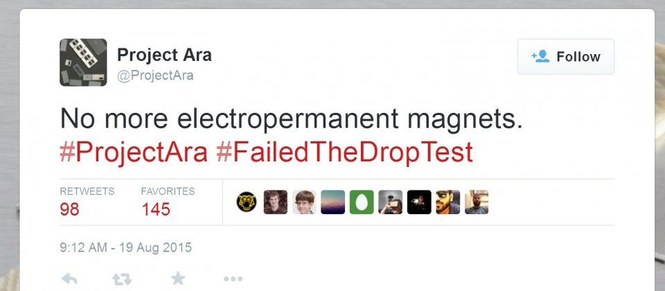 外界則推測,這是導致Ara專案延後的原因之一。該專案最初的規畫是利用電永磁鐵來組合手機內部的不同元件。然而,最近進行的摔落測試(Drop Test)結果不盡理想,可能是手機掉落後內部元件失去彼此間的連結而導致手機無法運作,因此決定尋求其他的解決方案,而延宕了Ara手機的進度。(編譯/陳曉莉)