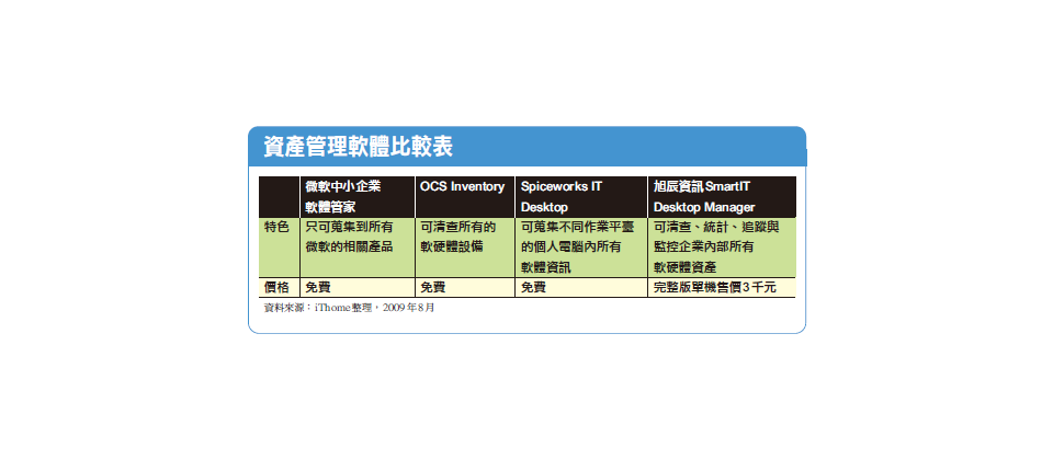 付費版本的功能較為完整,如旭辰資訊的SmartIT Desktop Manager可以清查、統計、追蹤與監控企業內部所有軟硬體資產。